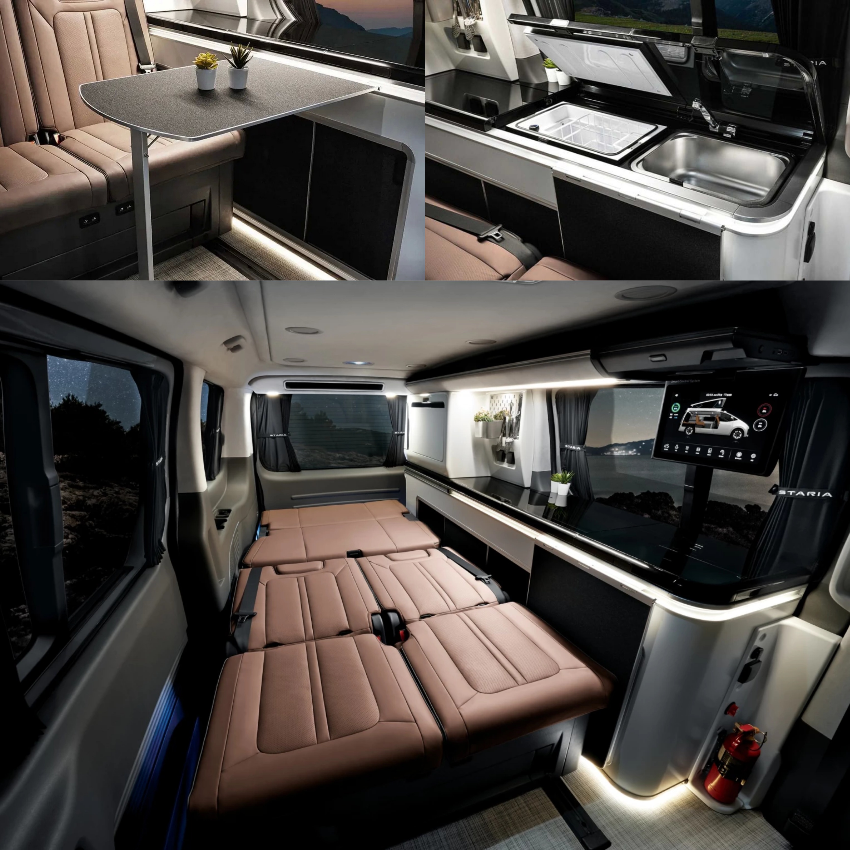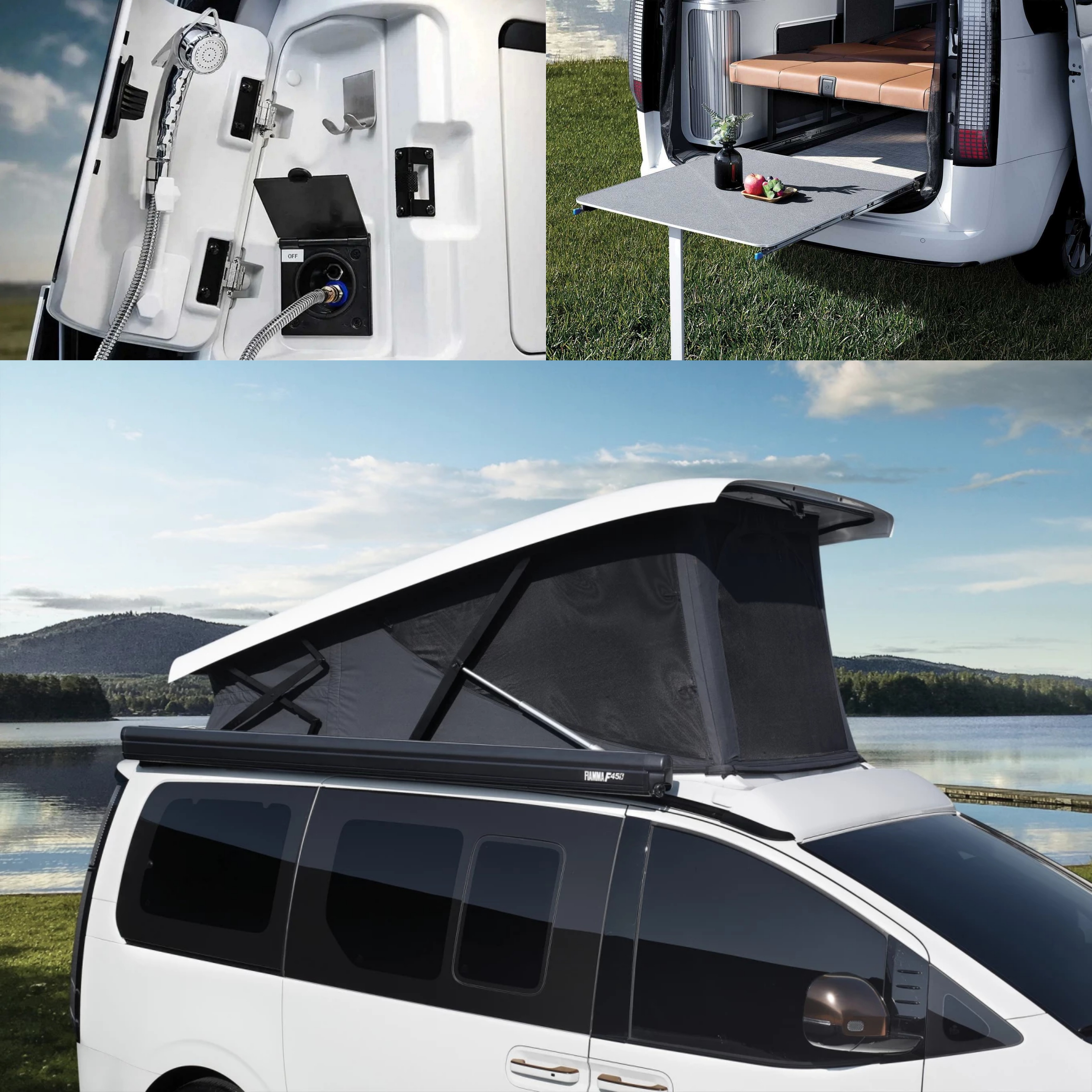 Dari eksterior, Staria ini sebenarnya mirip seperti versi standarnya. Namun bisa kita lihat bagian atap dimodifikasi agar bisa terbuka demi memberikan ruang lebih di kabin untuk tempat tidur. Ditambahkan juga tenda samping apabila ingin bersantai, terdapat pula meja yang bisa ditarik keluar dari bagasi belakang, dan dua ruang penyimpanan kursi lipat. kelambu untuk pintu belakang, dan catu daya eksternal untuk perlengkapan Anda.