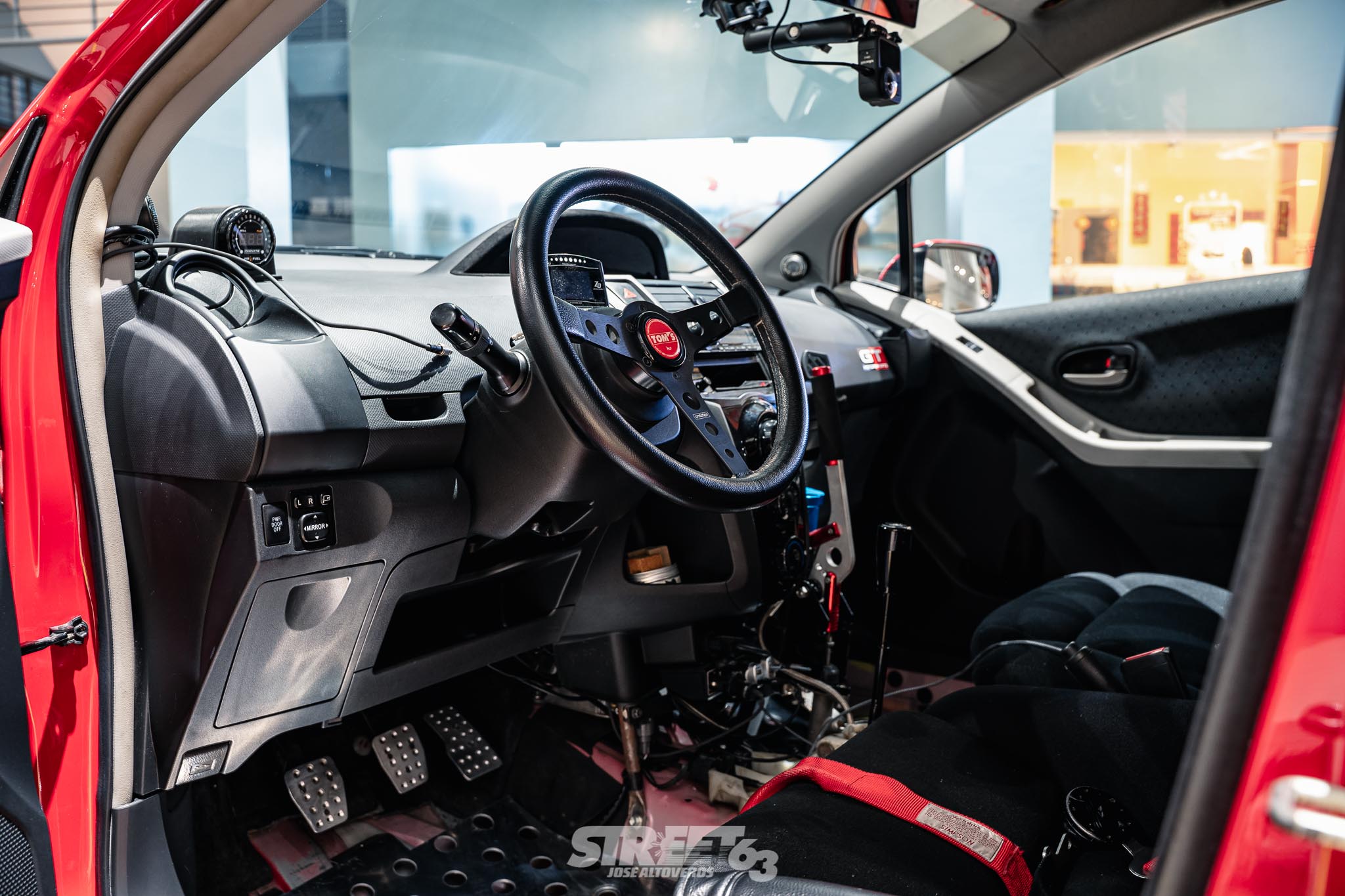 Lanjut ke bagian dalam, kesan street racing semakin kental berkat pemasangan roll cage enam titik, setir racing dari Momo Prototipo dikombinasi klakson Toms, short shifter kustom, jok model bucket Recaro Pole Position dan sabuk Sabelt enam titik.