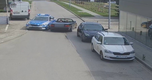 Adegan tersebut tertangkap kamera CCTV (keamanan) di sebuah pompa bensin kawasan Siercza, Polandia. Tampak pengemudi BMW 3-Series meluncur di tikungan menuju jalan utama hanya bertemu dengan mobil polisi yang menunggu dengan nyaman.