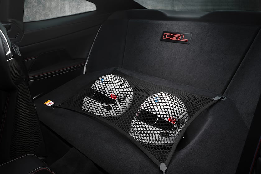 Bagian jok depan menggunakan model bucket dilapisi kulit Merino hitam dengan sisipan Alcantara merah dan jahitan M tricolor serta logo CSL di sandaran kepala menegaskan statusnya.