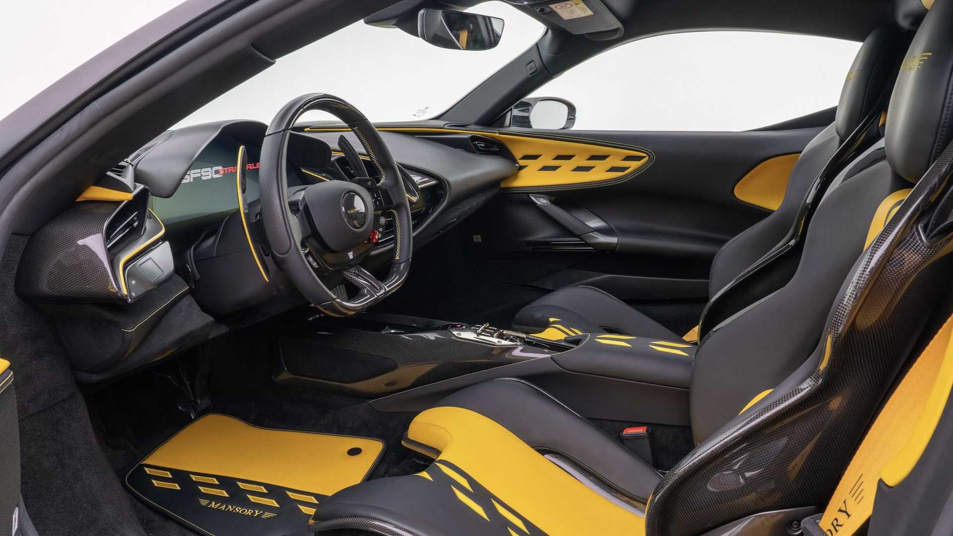 Mansory mendandani interior dengan sill plate forged carbon. Lalu nuansa kabin kombinasi balutan kulit hitam dan kuning di bagian jok, doortrim, aksen dasbor, hingga karpetnya. Serta tidak lupa panel karbon di dasbor, panel tengah, dan juga cangkang jok.