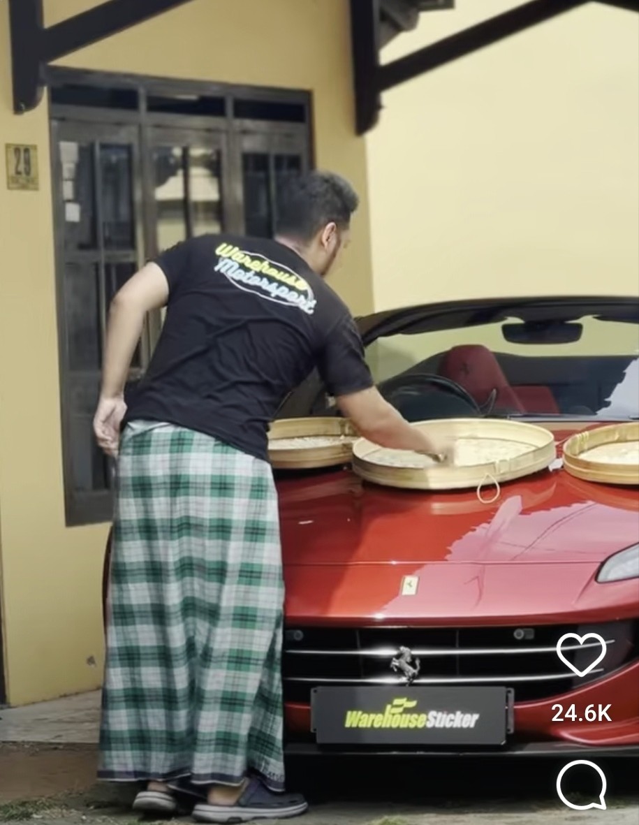 Entah itu konten atau hanya iseng, dalam video terlihat seorang pria sarungan membawa nampan berisi nasi bekas. Dia menjemurnya di Ferrari roadster (atap terbuka) berwarna merah.