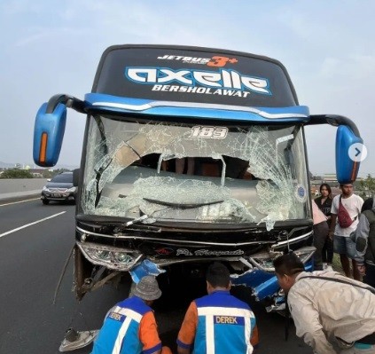 Bahkan, diunggah foto bagian depan bus yang hancur imbas tabrakan tersebut. Terlihat bus berwarna hitam dengan kelir biru itu mengalami kerusakan cukup parah pada bagian kaca dan bember depan.