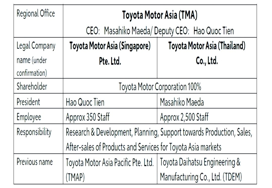 "Perubahan ini penyelarasan yang lebih baik antara penelitian dan pengembangan, manufaktur, penjualan dan layanan, yang dilambangkan dengan nama Toyota Motor Asia. Ini merupakan langkah signifikan menuju peningkatan fokus pelanggan kami di dunia yang berubah dengan cepat," ujar DCEO operasi Toyota Asia dari TMC, Hao Quoc Tien.