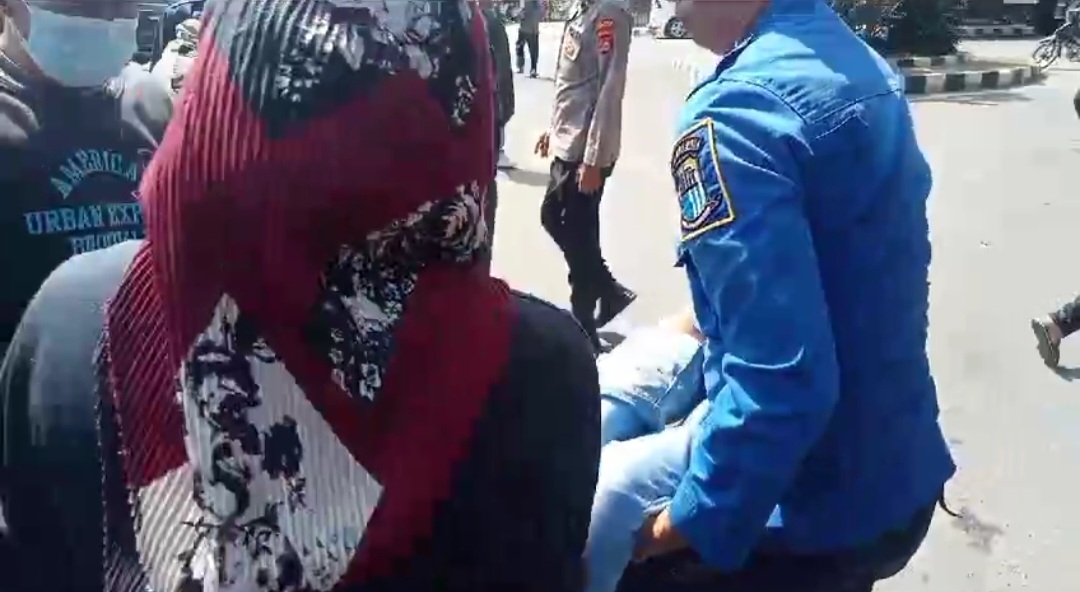Seorang wanita pendemo mengalami insiden kaki terbakar saat melangsungkan aksi demo di Kantor DPRD Lebak, Banten, Selasa (19/12/2023) siang. Foto iNews/Iskandar Nasution