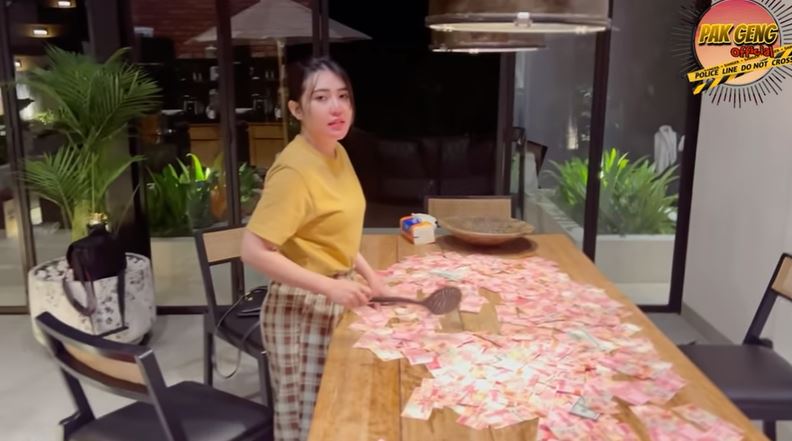 2. Via Vallen menyiapkan uang lembaran seratus ribuan dan beberapa uang dolar di meja.