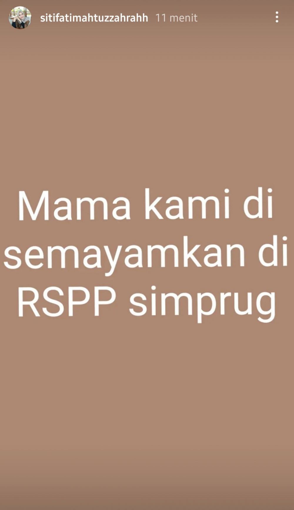 "Mama kami disemayamkan di RSPP Simprug," tulis akun @sitifatimahtuzzahrahh.