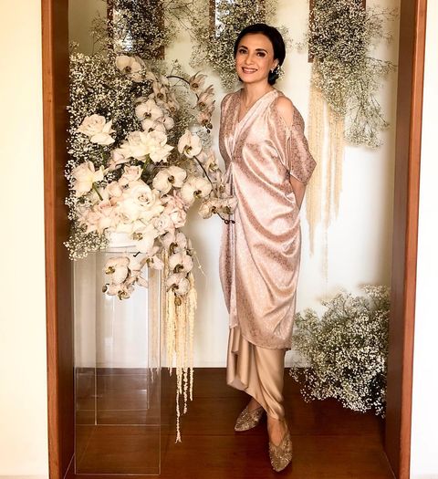 4. Tak kalah stylish gaya ibunda Sherina, Luki Ariani. Di pernikahan putrinya, ia tampil cantik dengan abaya cokelat yang dipadukan heels warna serupa.