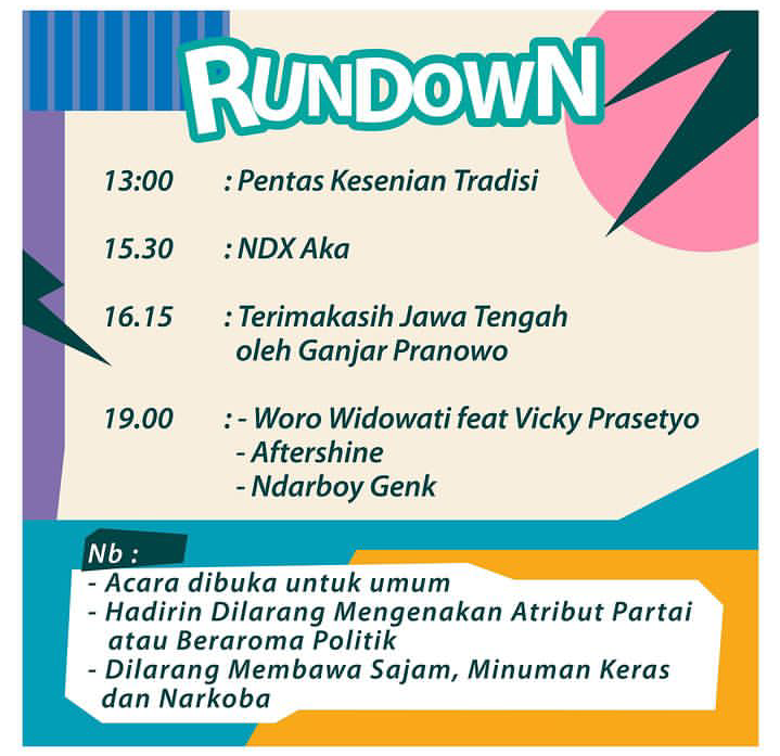 Acara pesta rakyat Terima Kasih Jawa Tengah itu akan digelar dengan rundown berikut ini: