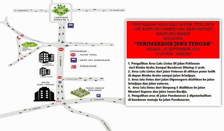 Pengalihan arus lalu lintas, dimulai pada Senin malam (4/9), kondisional sekitar pukul 22.00-24.00. Ini karena ada aktivitas bongkar muat di sekitar ruas Jalan Pahlawan. Pengalihan arus akan dilanjutkan hingga Selas (5/9), guna pembersihan area, katanya dikutip dari laman resmi Pemprov Jateng.