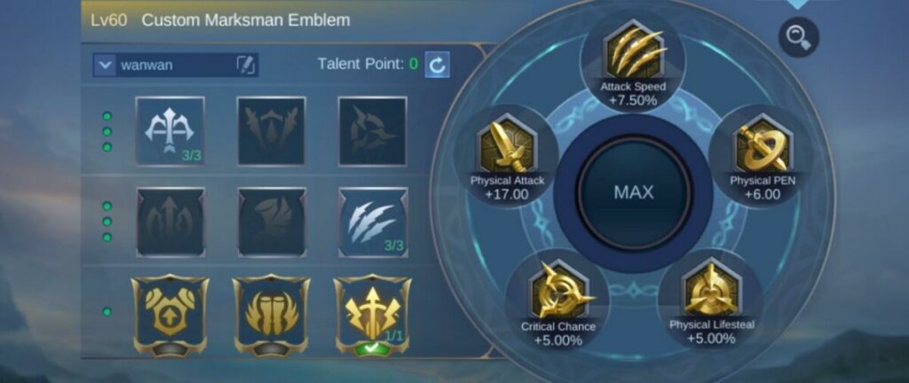 Sebagai Marksman sejati, Wanwan juga wajib menggunakan emblem Marksman untuk memaksimalkan damage dan potensi yang dimilikinya. Itulah mengapa para user Wanwan harus memiliki emblem Marksman Level 60 atau maksimal.