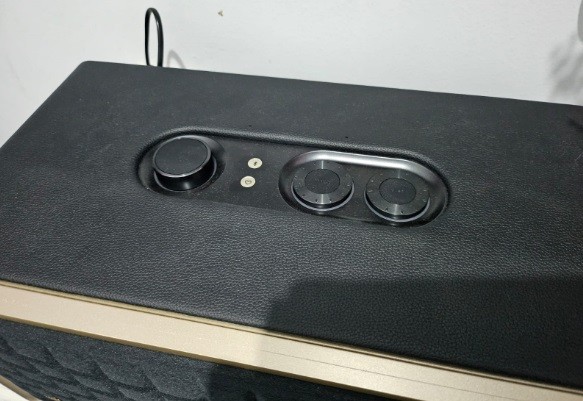 Di bagian atas speaker juga ada sejumlah pengaturan yang tersusun rapi di tengah. Ada tombol speaker, treble, dan bass. Pengaturannya pun sangat mudah, hanya perlu memutarnya untuk menyesuaikan trebel, bass, dan volume suara.