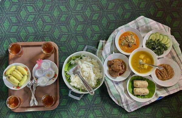 Pelengkap tak kalah penting adalah lalapan khas seperti jantung pisang, kecipir, terong telunjuk, hingga bunga kencur. Disajikan bersama sambal serai yang aromatik, membuat seluruh sajian dalam dulang menjadi semakin kaya rasa dan warna.